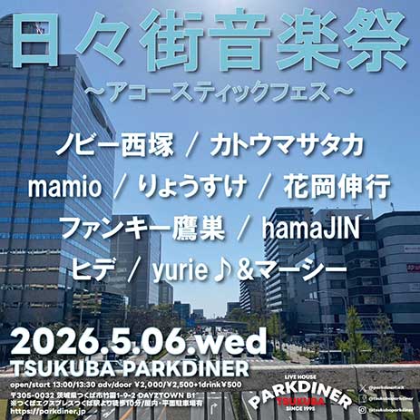 日々街音楽祭~アコースティックフェス~ 5月 6 Wed 2026 ライブ open/start 13:00/13:30 adv/door ¥2,000/¥2,500+1drink¥500 act ノビー西塚 / カトウマサタカ / mamio / りょうすけ / ファンキー鷹巣 / hamaJIN / ヒデ / yurie♪&マーシー / 花岡伸行 ticket info PARKDINER / 各出演アーティスト 前のスケジュール 次のスケジュール